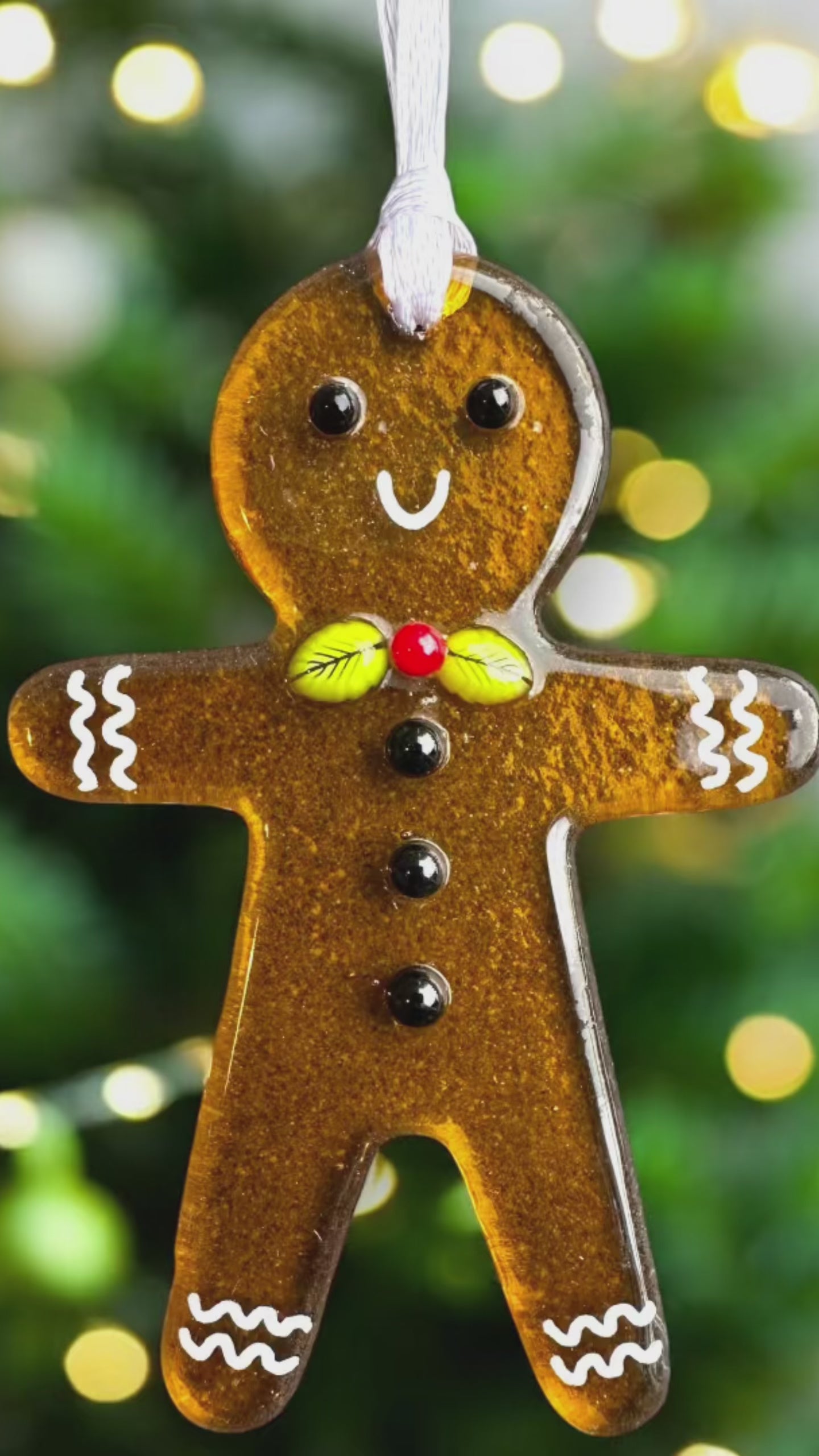 Handmade fused glass gingerbread men & ladies 🎁 Choose your favourite design, gift-boxed & ready to hang on your tree.
