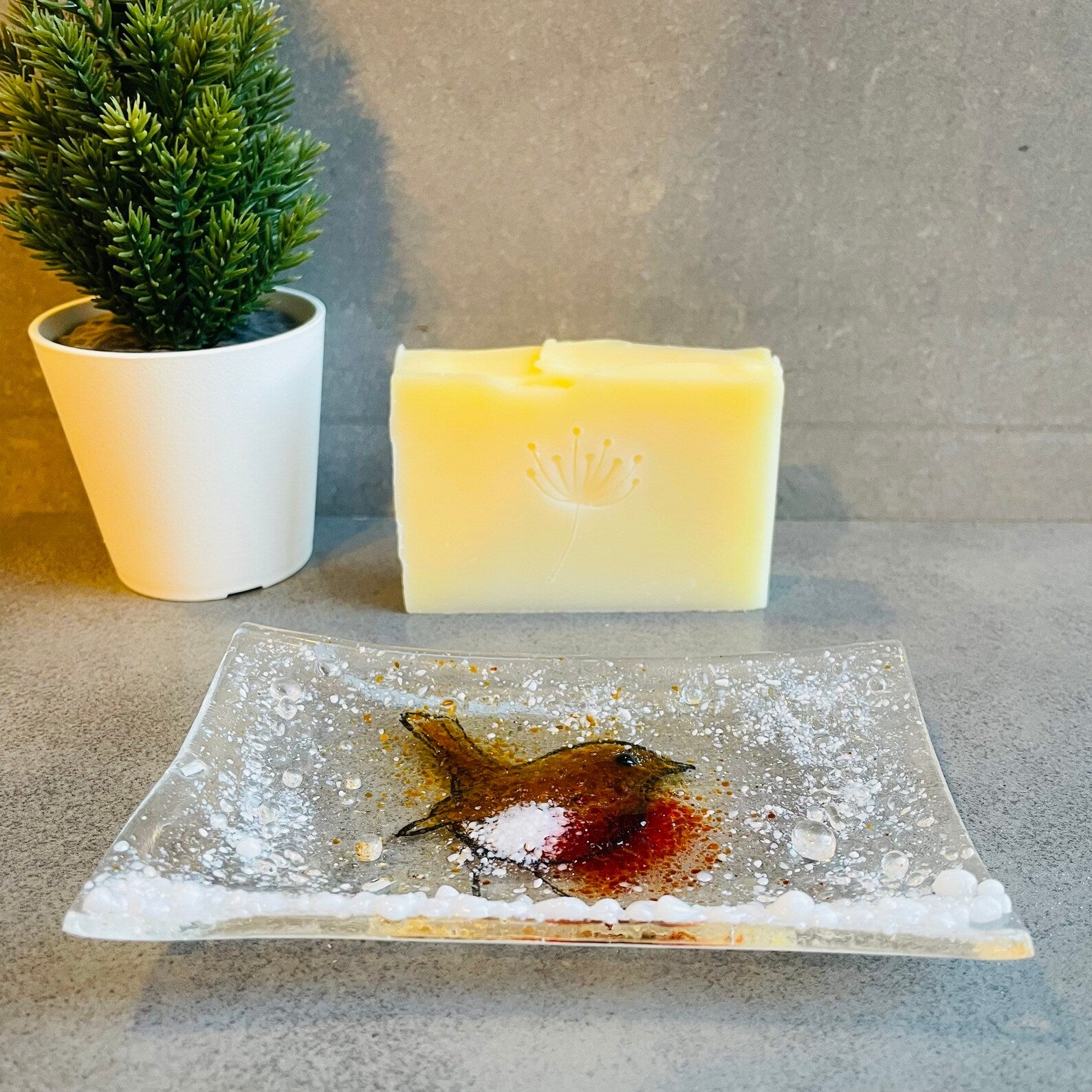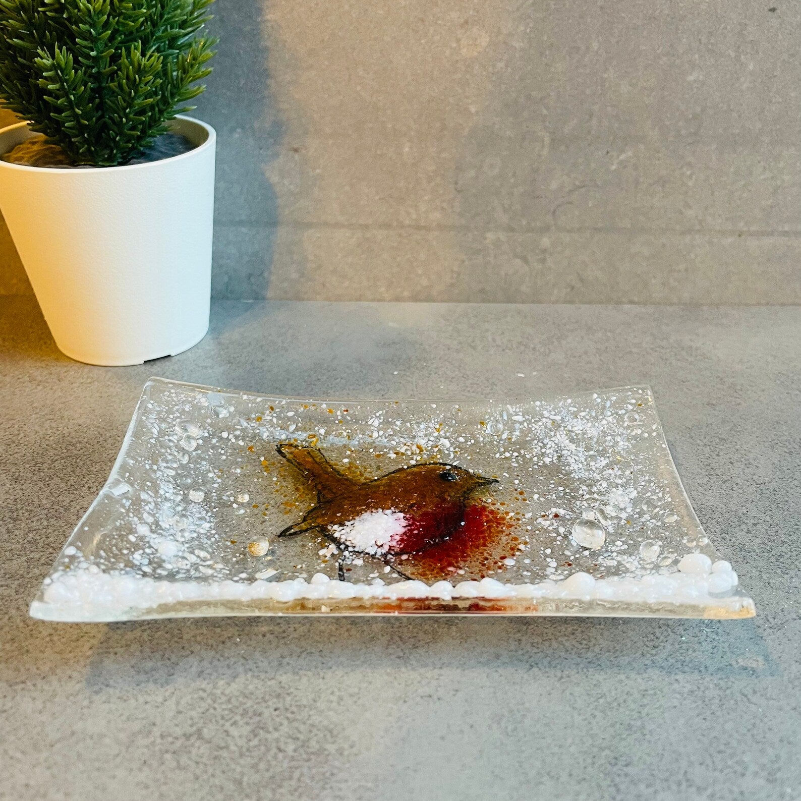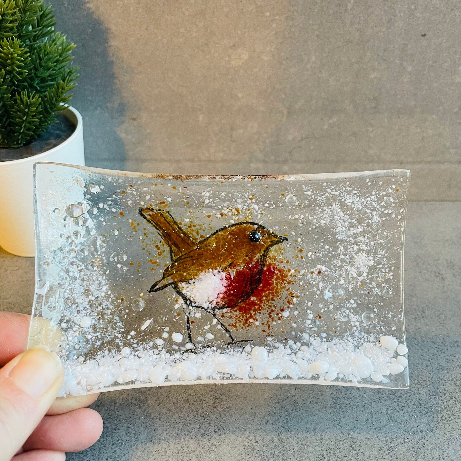 A handmade fused glass CHristmas robin soap dish .