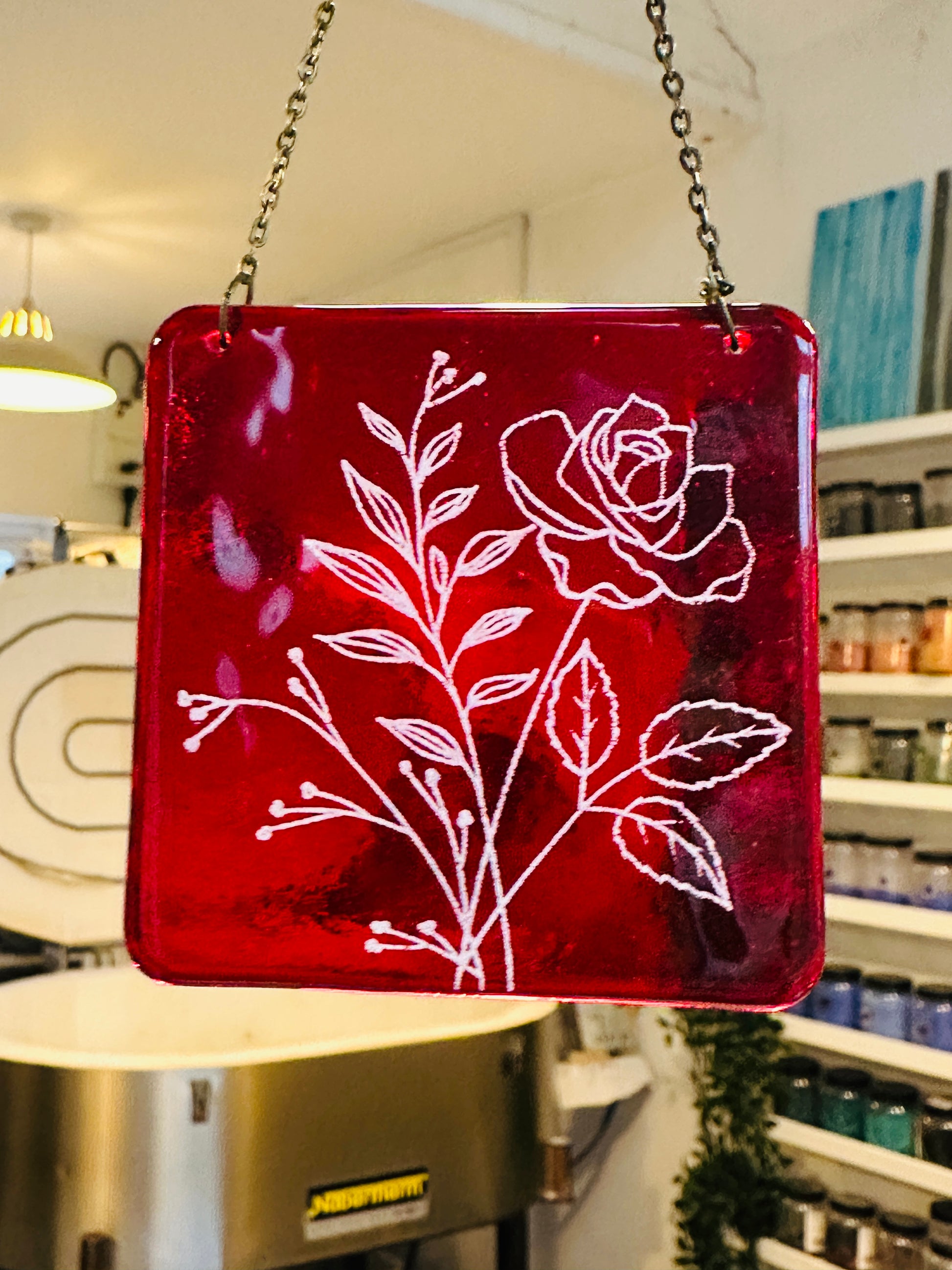 A limited batch of our handmade fused glass birth flower suncatchers, now available as end-of-line pieces.