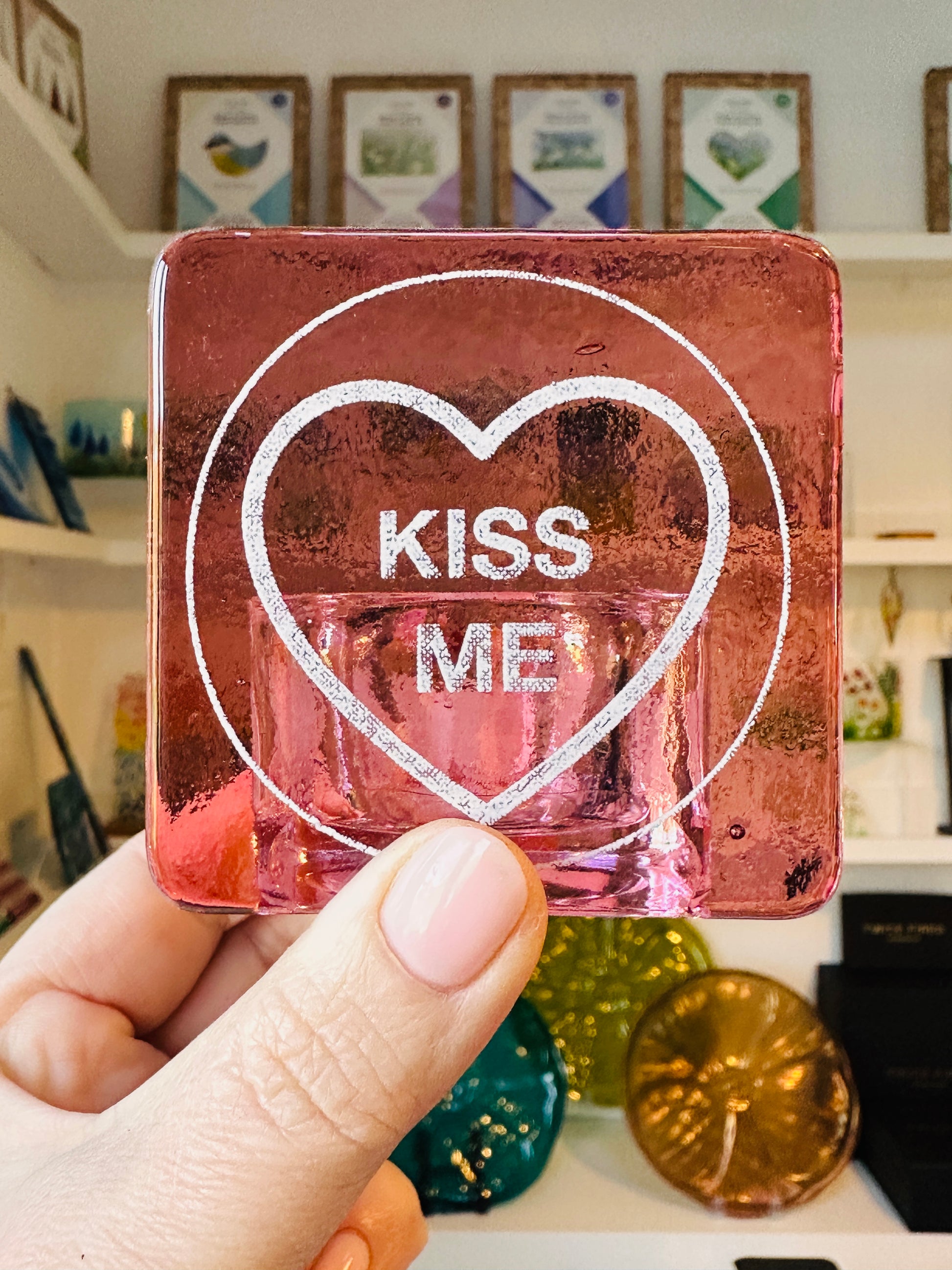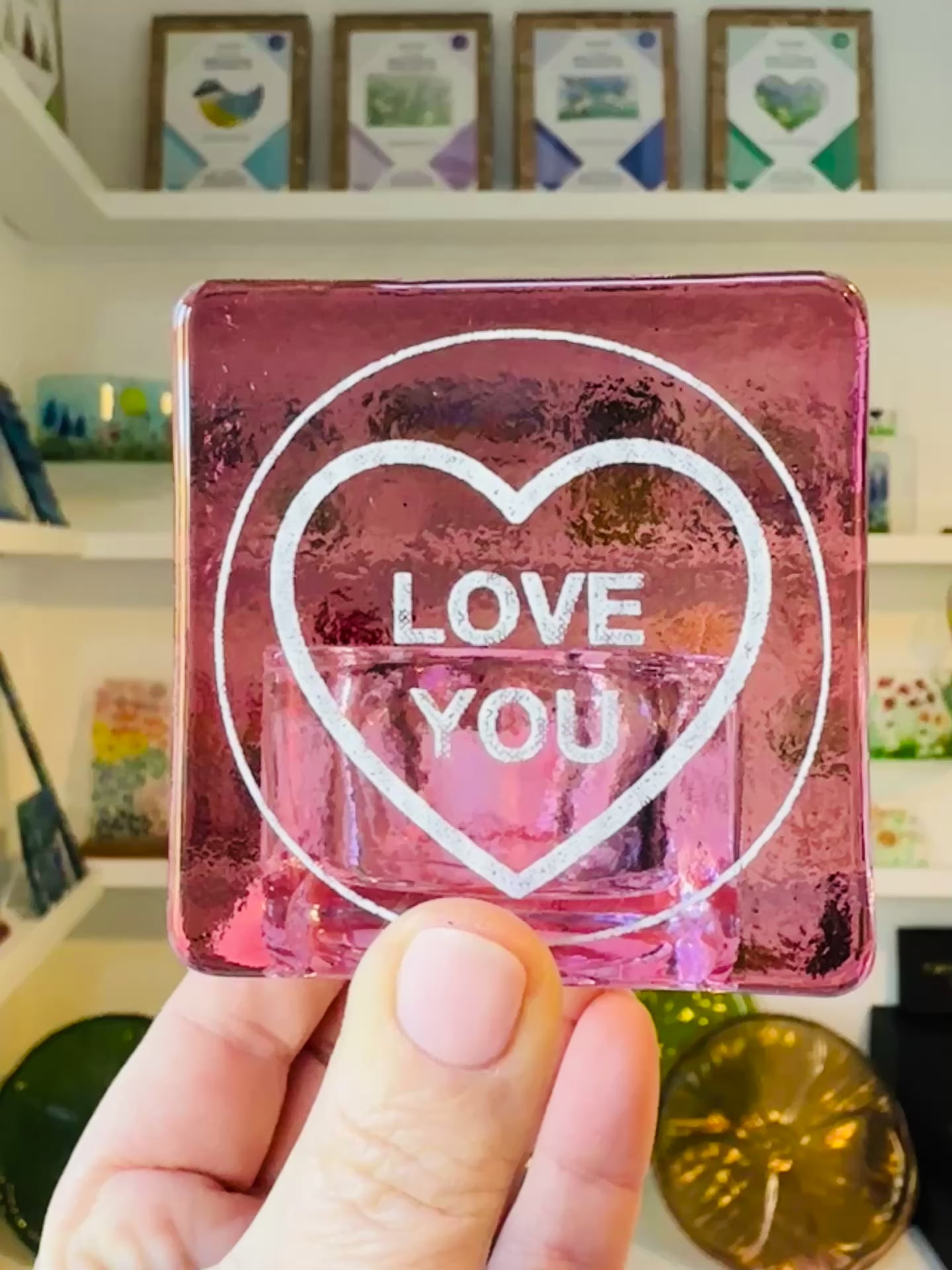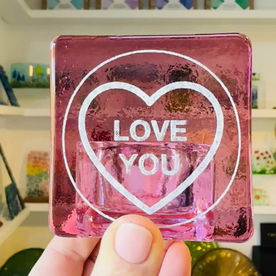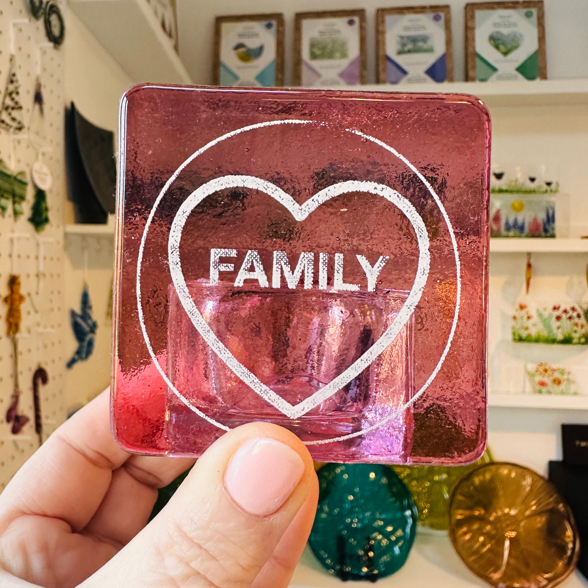 Fused glass pink and white LOVE YOU, ALWAYS, FAMILY Tea light holders.